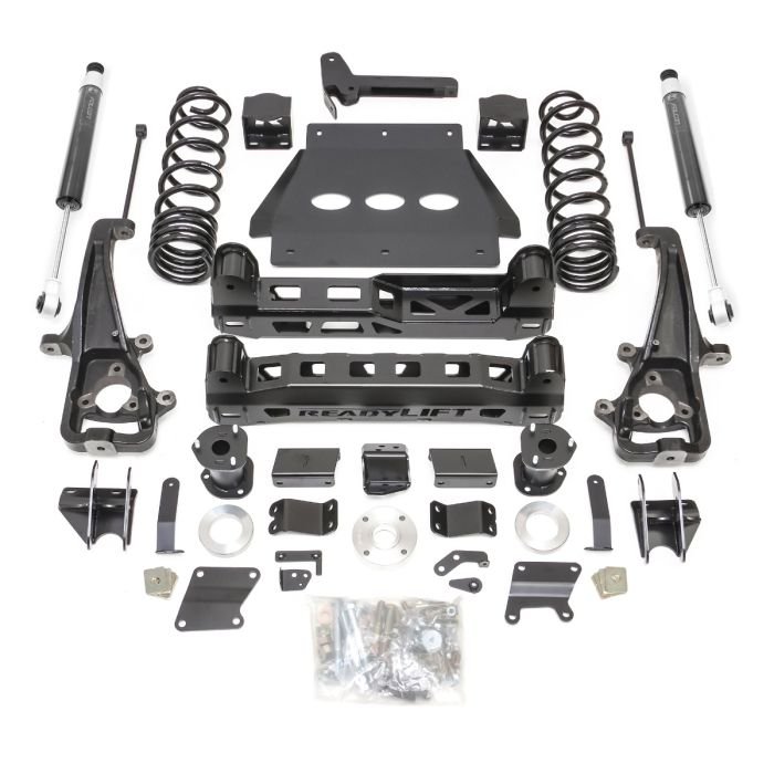 4” (4” + 2”) kit yields 6” of total lift with factory 2” lift and AutoWheelZone’s 4” lift Delivers clearance for increased aftermarket tire sizes – up to 35×12.50 on 6-inch kit on 9″ wide wheels with 0 offsets with no trimming -18 offset will require minor trimming.The proprietary lower strut clamshell design maintains factory geometry and retains the use of the factory strut.3/16-inch-thick steel plate cross members and skid plate.Anti-torsion boxed and gusseted plate steel differential drop brackets.Includes ReadyGuard Powertrain Warranty.NOTES: Use of Auto 4 Hi feature not recommended. Not compatible with rear mono-leaf springs.